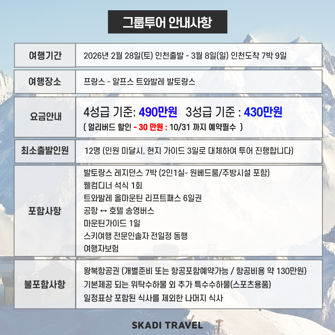 – 본 상품은 (스키 전문) 인솔자가 동행하는 상품입니다.