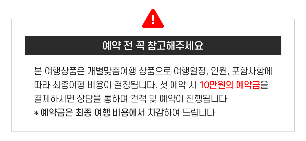 [특별조항] 본인의 부주의로 정해진 여정에 차질이 발생시, 추가되는 모든 비용에 대해서는 본사가 배상하지 않습니다. 기상상황으로 인하여 항공스케줄이 변경되거나 현지 도로사정으로 인하여 여행일정이 변경되어 현지 체류비용이 발생될 시에는 본인이 지불하는 조건입니다. |
