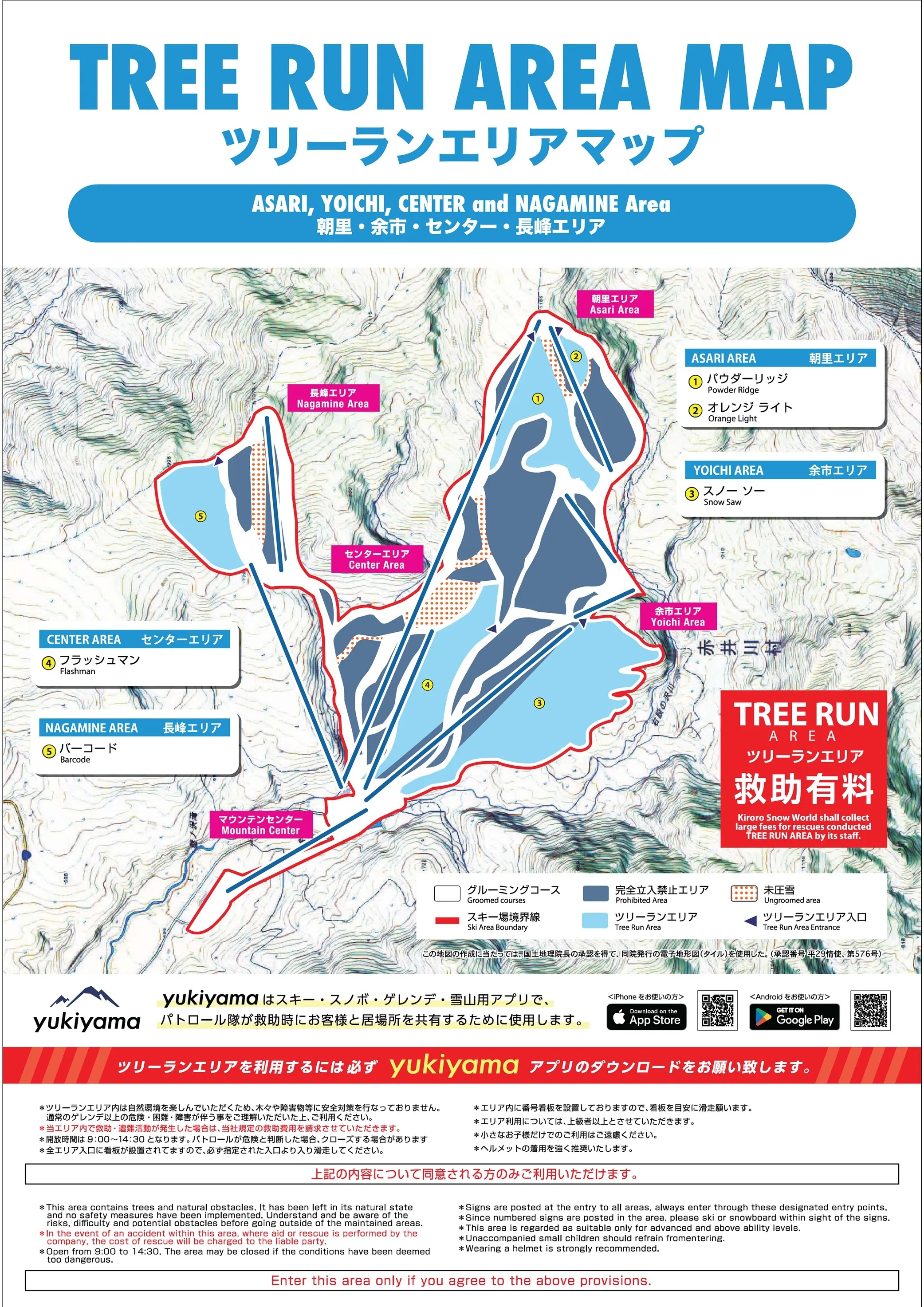 | ※ 아래의 내용을 동의하는 사람만 이용할 수 있습니다. • 이 구역은 자연 그대로 보존되었으며, 안전 조치가 이루어지지 않았습니다. • 사고 발생 시 구조 비용은 책임 당사자가 부담합니다. • 운영 시간은 9:00~14:30이며, 위험할 경우 구역이 폐쇄될 수 있습니다. • 표지판이 설치되어 있으므로, 반드시 지정된 출입구를 통해 진입하십시오. • 이 구역은 상급자 이상을 위한 구역입니다. • 동반자가 없는 어린이는 진입할 수 없습니다. • 헬멧 착용을 강력히 권장합니다. • yukiyama는 스키, 스노보드, 슬로프, 설산용 애플리케이션이며, 순찰대가 구조 시 고객과 위치를 공유하기 위해 사용됩니다. 트리런 구역을 이용하는 분은 반드시 yukiyama 앱을 다운로드해 주시기 바랍니다. |