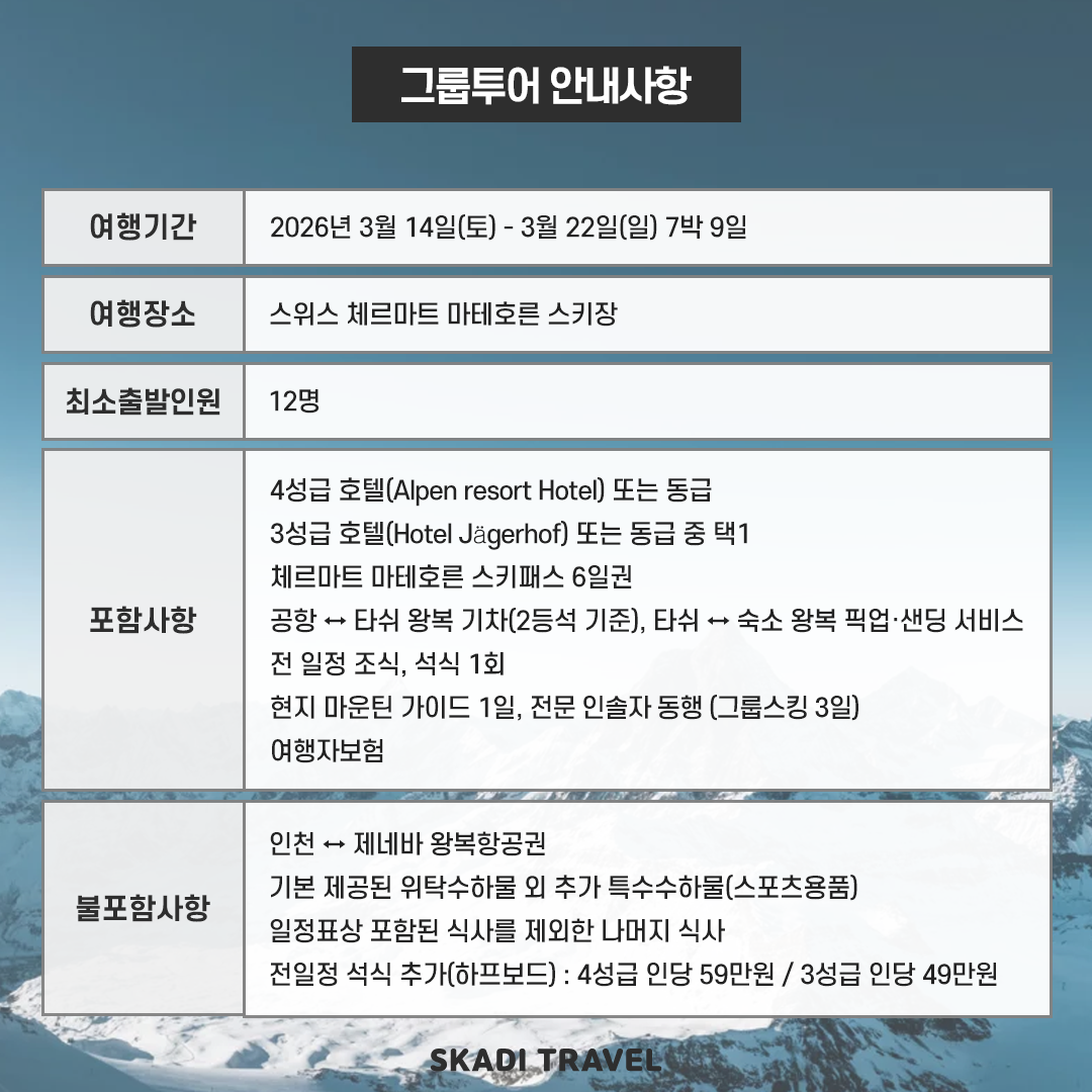| 체르마트+밀라노10박 [4성급호텔] | 7박 9일 | 0859 | 8,590,000원 |