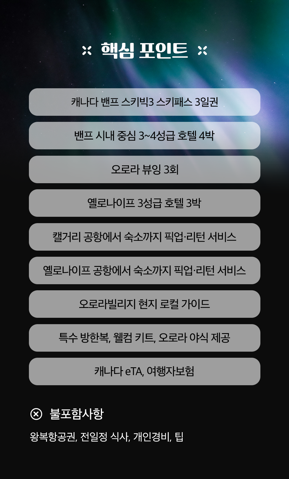 | 밴프 스키+오로라투어 2인1실 | 7박 9일 | ws685 | 3,850,000원 |